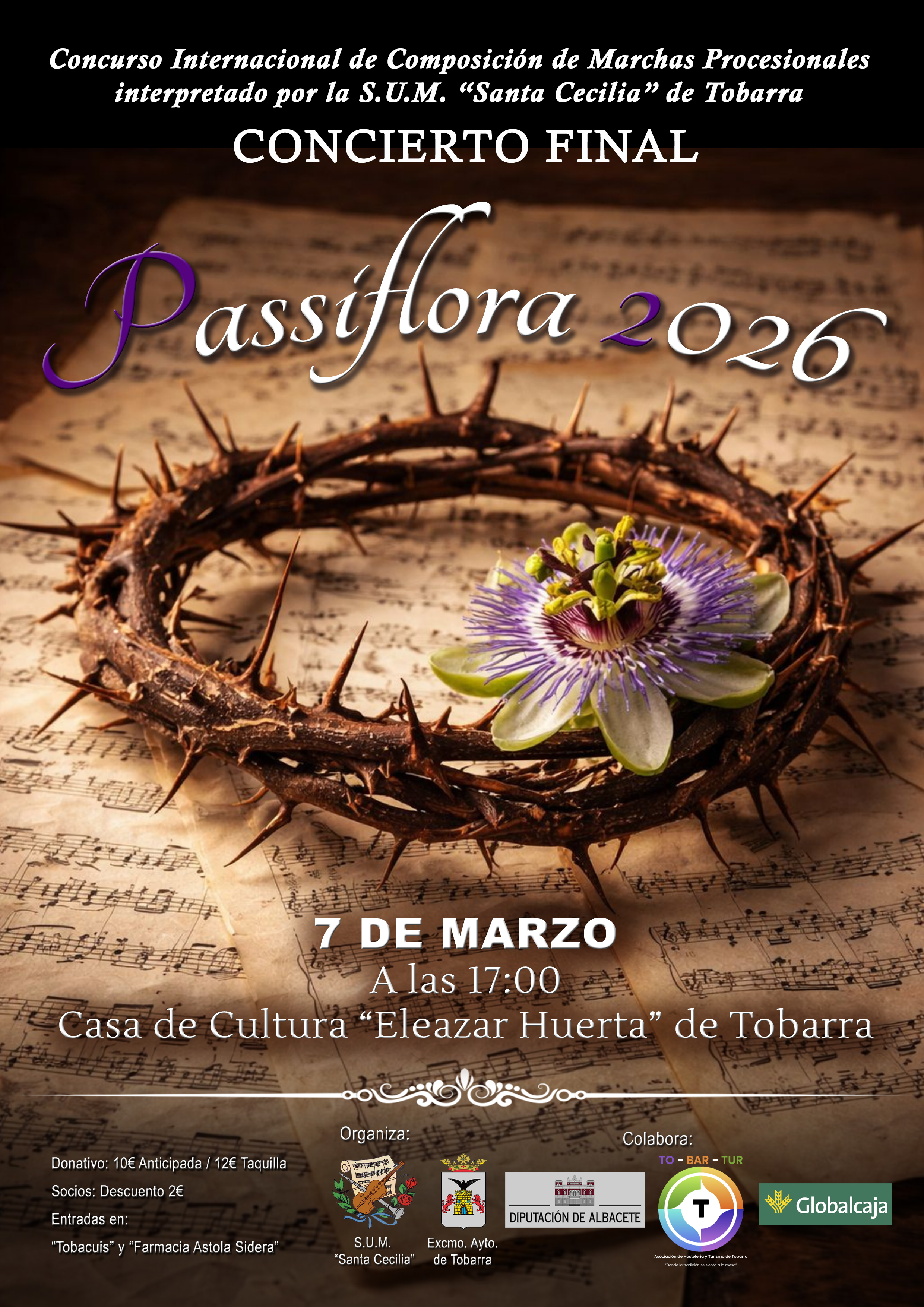 La Sociedad Unión Musical "Santa Cecilia" de Tobarra convoca el Concurso Internacional de Composición de Marchas Procesionales, denominado "Passiflora 2026", con tres objetivos principales: Renovar activamente el repertorio de la S.U.M. "Santa Cecilia", haciéndolo además con Marchas Procesionales de composición exclusiva y de calidad; Incrementar el patrimonio musical de la Semana Santa de Tobarra, usado como medio de divulgación de nuestra fiesta grande; Impulsar la composición dedicada a la Semana Santa, estimulando la dedicación, creatividad y desarrollo de este arte musical.